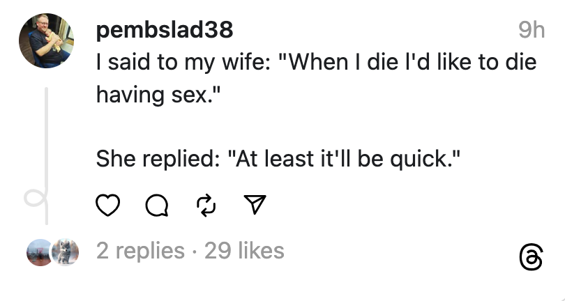 Every week, we round up the funniest posts from couples on those platforms. Scroll down to read the latest batch: