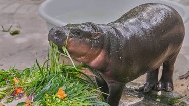 Fans took pictures of the baby hippo on their cameras or cell phones and sang “Happy birthday” as her birthday cake, made of a variety of fruits and vegetables, was placed near the pond.